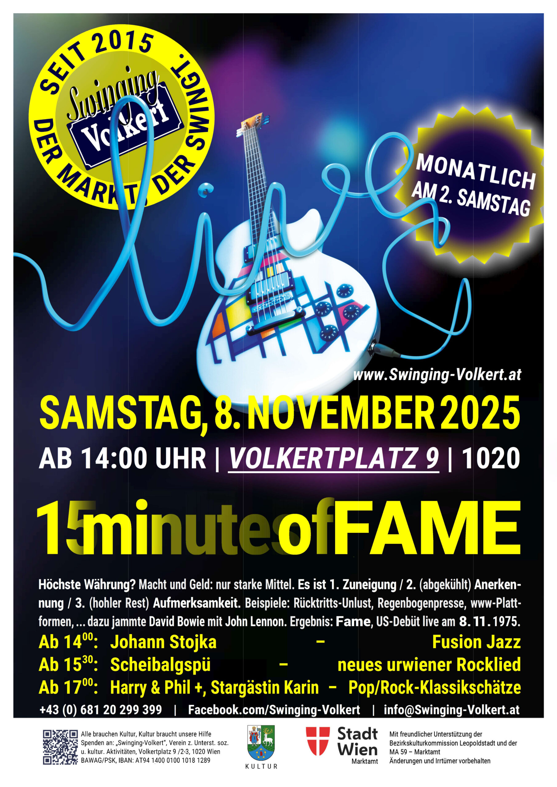 Höchste Währung? Macht und Geld: werden oft dafür gehalten, sind aber nur starke Mittel, um das Ziel zu erreichen. Es ist 1. Zuneigung / 2. (abgekühlt) Anerkennung / 3. (hohler Rest) Aufmerksamkeit. Beispiele: Rücktritts-Unlust, Regenbogenpresse, inzwischen auch www-Plattformen (zu denen Andy Warhols Bemerkung von 1967 besonders gut passt: „everyone will be famous for 15 minutes“). Dazu jammte David Bowie mit John Lennon. Ergebnis: fame, US-Debüt live am 8. 11. 1975. Exakt 50 Jahre danach ist es dieses Mal das Motto unseres Konzerts.
